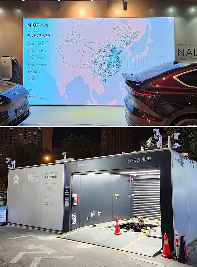 니오 측 관계자는 "고속도로에 895개의 파워 스테이션을 설치했다. 전기차 충전 시간이 보통 30분에서 1시간 정도 걸린다. 명절에 고속도로 통행이 많아지고 고객들이 배터리 충전이 필요하다고 생각하는데, (교체에) 3-5분 정도 걸리는 배터리를 교환하면 된다고 현실로 만든 것"이라고 소개했다.