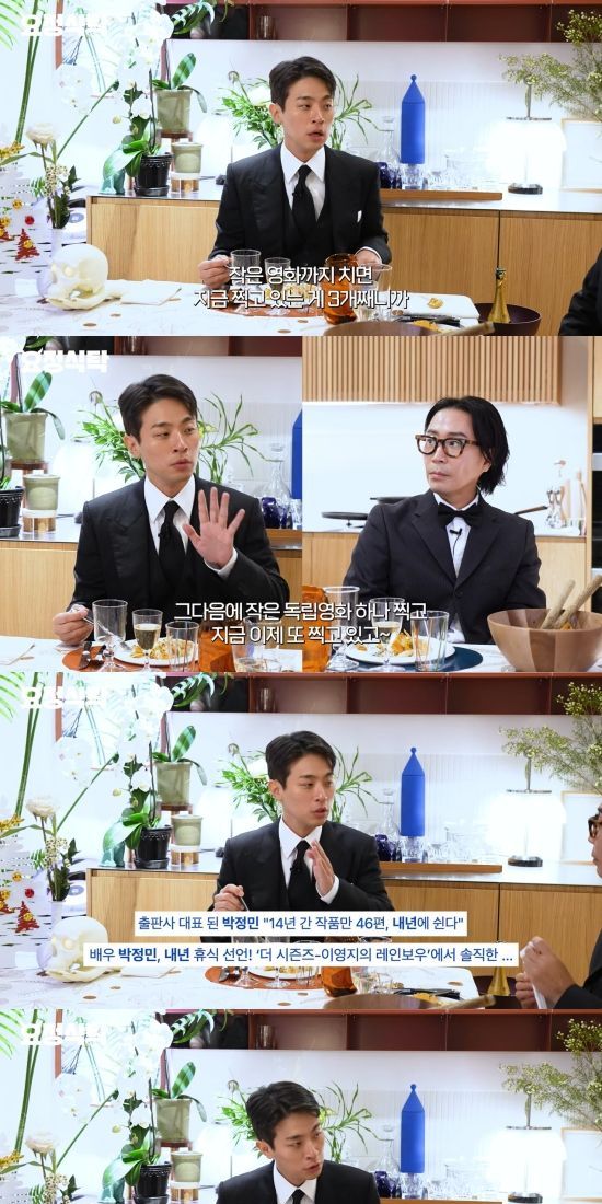 "너무 바쁜 거 아니냐"는 정재형의 물음에 박정민은 "그래서 저 내년에 쉬려고 여기저기 공식적으로 얘기하고 다닌다. 안 그러면 안 쉴까봐"라고 활동 중단 계획을 언급했다.