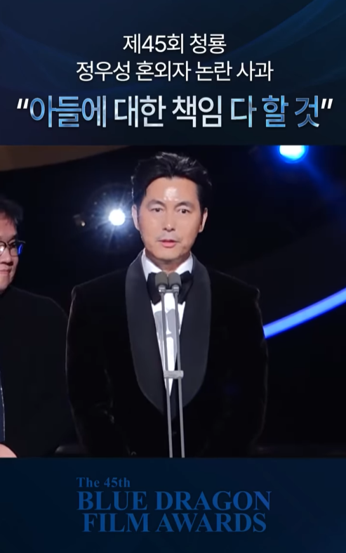 이어 굳은 얼굴의 정우성은 "모든 질책은 제가 받고, 안고 가겠습니다. 그리고 아버지로서 아들에 대한 책임은 끝까지 다할 것입니다"라고 말을 이었고, 관객석에 앉은 영화인들의 박수와 환호를 받았다.