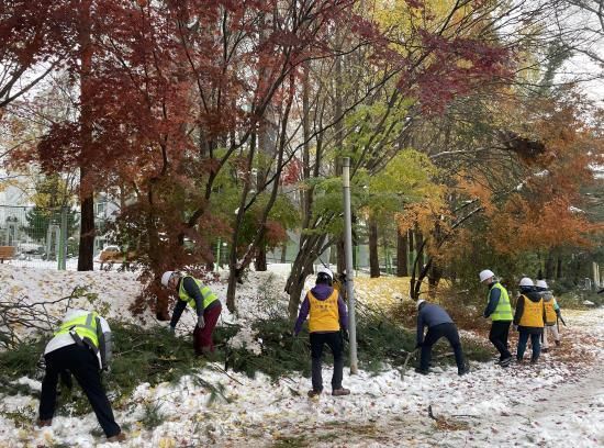 폭설로 인해 주저앉은 가지를 세우고 쓰러진 나무는 정비해 적재하는 등 피해가 극심한 비전사거리 완충녹지 정비 등 봉사활동을 진행해 시민들의 불편과 사고를 예방하는 데 힘썼다.