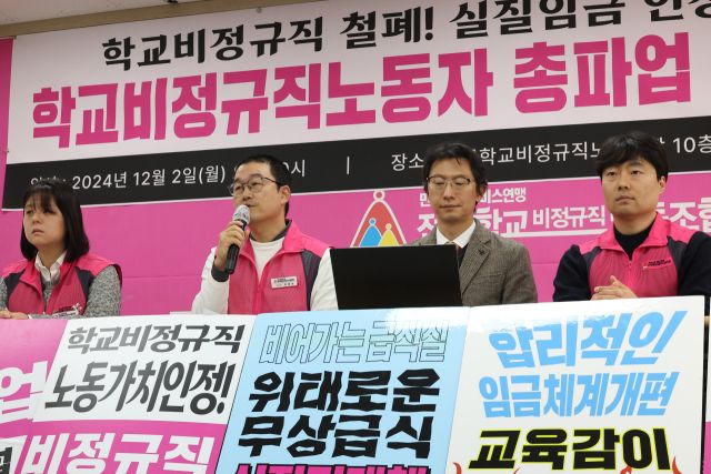 전국학교비정규직노동조합은 2일 서울 용산구 학비노조 사무실에서 기자회견을 열고 "임금, 신분 차별을 끝내기 위해 파업에 나선다"고 밝혔다.