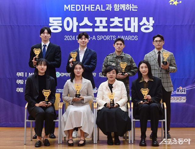 스포츠동아가 동아일보, 채널A와 공동으로 주최하고 국내 5대 프로스포츠(프로야구·프로축구·남녀프로농구·남녀프로배구·남녀프로골프) 종목별로 올 한해를 빛낸 최고의 선수를 선정하는 ‘메디힐과 함께하는 2024 동아스포츠대상‘ 시상식이 2일 서울 성북구 고려대학교 백주년기념관에서 개최됐다. 뒷줄 왼쪽부터 시계방향으로 남자배구 허수봉(현대캐피탈), 남자농구 이정현(고양 소노), 축구 이동경(김천 상무), 야구 김도영(KIA 타이거즈), 여자배구 김연경(흥국생명), 남자골프 장유빈(신한금융그룹) 대리수상 장정윤 씨(고모), 여자골프 박현경(한국토지신탁), 여자농구 김단비(아산 우리은행)가 기념촬영을 하고 있다. 주현희 기자 teth1147@donga.com