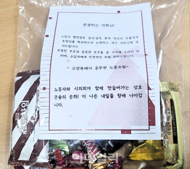 ‘고양시 산하 공무원과 시의회간 상호존중 문화정착 캠페인’은 노조가 코로나 이전부터 지속적으로 펼쳐온 활동으로 시의회 상임위원과 배석한 공무원을 위해 준비한 간식꾸러미 나눔 행사다.