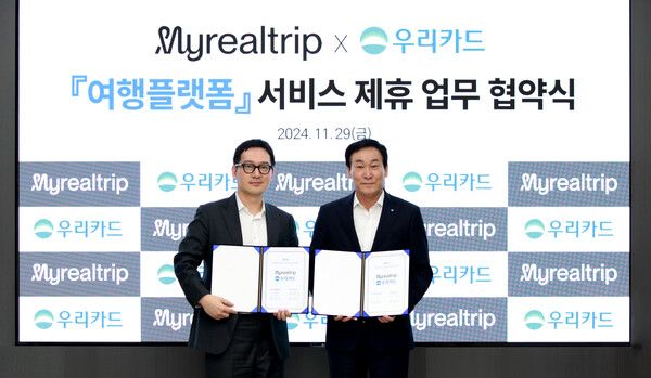 지난달 29일 우리카드 광화문 본사에서 진행된 행사에는 박완식 우리카드 대표이사와 이동건 마이리얼트립 대표이사 등이 참석해 양사 간 상호 협력을 약속했다.