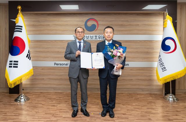고학수 개인정보보호위원회 위원장(왼쪽)이 2일 오후 정부서울청사에서 강영수 신임 분쟁조정위원장과 기념촬영을 하고 있다. ⓒ 개인정보보호위원회