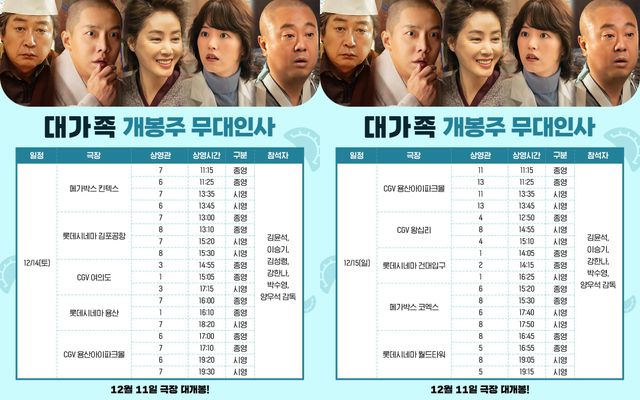'대가족' 팀은 오는 14일 토요일 메가박스 킨텍스를 시작으로 롯데시네마 김포공항, CGV 여의도, 롯데시네마 용산, CGV 용산아이파크몰을 방문한다.