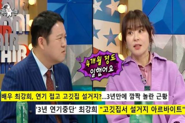 최근 방송된 MBC 예능 프로그램 '라디오스타'에서는 게스트로 최강희가 출연해 연기 중단을 한 후 아르바이트 영상을 올려 화제가 된 것에 대해 "홀로 자립해 보려고 3년 전에 연기를 내려놨다."라고 말했다.