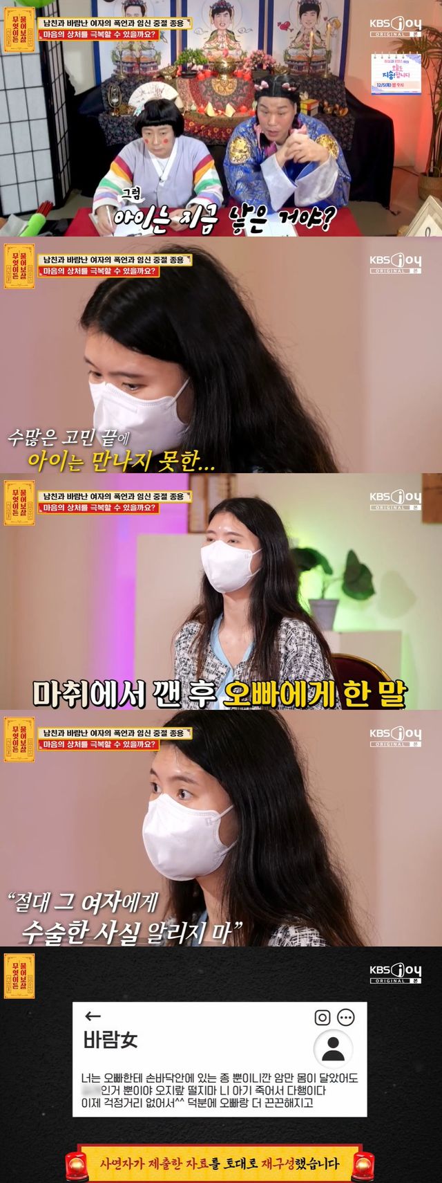 2일 방송된 KBS JOY '무엇이든 물어보살' 294회에는 남자친구와 바람난 여자의 폭언과 임신 중절 종용을 당하며 받은 마음의 상처와 기억에서 벗어나고 싶다는 사연자가 출연했다.