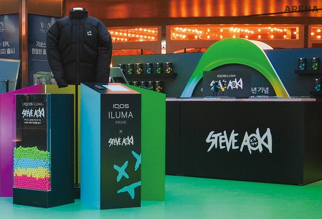 바로 타바코 스틱을 재활용해 충전재로 활용한 ‘아이코스X스티브 아오키 한정판 리사이클 재킷’을 선보이는 것. 어둠 속에서 밝게 빛나는 ‘Aoki’ 로고를 자수로 새기고, 아이코스를 보관할 수 있는 주머니를 곁들인 디테일한 디자인이 특징이다. 이 특별한 만남을 기념하기 위해 아이코스는 지난 11월, 삼성 파르나스 몰에서 팝업 이벤트를 열었다. 한정판 아이템 전시와 함께 DJ 체험, 비트 마니아 게임 부스, 래플 이벤트 등 다양한 참여형 이벤트를 진행해 축제 같은 분위기를 펼쳤다.