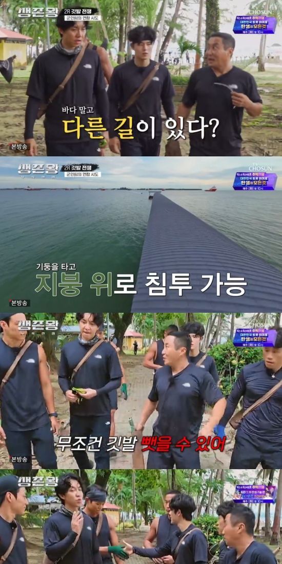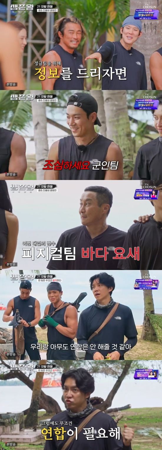 결국 군인팀(이승기, 강민호, 아모띠)은 정글팀(김병만, 정지현, 김동준)과 연합을 맺기로 했다. 이승기는 정글팀을 만나 "피지컬팀이 자리가 너무 유리하다"라며 설득했고, 김병만은 "안전한 게 아니다. 지금 물로 밖에 못 간다고 하지. 나랑 동준이랑 매달리는 걸 잘한다. 다리 위에 지붕 있지 않냐. 거기로 잡고 호위해서 가면 무조건 깃발을 뺏을 수 있다. 힘을 합친다면"이라며 작전을 세웠고, 강민호는 "안전하게 저는 물 밑으로 가겠다"라며 거들었다.