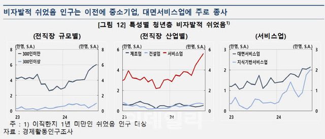 비자발적으로 쉬고 있는 청년들의 경우엔 일자리 미스 매치와 기업의 경력직 및 수시 채용 선호 등 구조적 요인 외에도 경기적 요인도 일부 영향을 미친 것으로 보인다. 이 과장은 이직한 지 1년 미만인 쉬었음 인구 대상 조사를 근거로 “비자발적 사유로 쉬고 있는 청년층은 주로 중소기업과 대면 서비스업에 종사했던 것으로 분석된다”고 말했다. 상대적으로 고용의 질이 떨어지는 일자리로 이직했다가 ‘쉬기로’ 결정한 청년층이 많았다는 의미다.