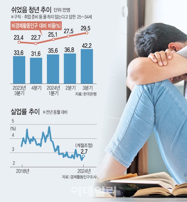 청년층 쉬었음 인구는 지난해 3분기 33만6000명에서 올해 3분기 42만2000명으로 1년 새 25.4% 증가했다. 특히 이 중 취업경험이 있는 쉬었음 청년이 40만명에 육박해 대부분을 차지하는 것으로 나타났다.