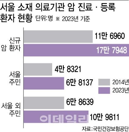 2일 국민건강보험공단이 집계한 2023년 시도별·요양기관시도별 신규 중증(암) 진료·등록환자 현황을 분석한 결과, 지난해 서울 소재 의료기관의 신규 암 진료·등록환자는 17만 7948명으로, 이중 서울 외 주민은 10만 9811명으로 나타났다. 10명 6명이 서울 외 지방 소재 환자인 셈이다. 이같은 지방 환자의 서울 쏠림은 10년 전보다 심화된 상태다. 지난해 지방 주민이 서울에서 암 치료를 시작한 비율은 36.22%로, 10년 전인 2014년(34.95%)에 비해 1.27%포인트 높아졌다. 서울 주민 신규 암 환자가 서울에서 진료 받지 않은 변수를 고려하면 지방 환자 수치는 더 커질 수도 있다.