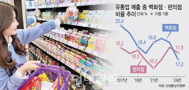 지난해 백화점(17.4%)과 편의점(16.7%)의 매출 비중 차이는 0.7% 포인트에 불과했다. 업계에서는 올해 큰 이변이 없다면 편의점이 백화점을 앞지르는 첫해가 될 것으로 보고 있다. 편의점은 2021년 대형마트의 연간 매출을 앞섰다. 이후 3년 만에 백화점까지 넘어서게 되는 셈이다.