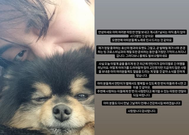이어 반려견 연탄이의 안타까운 소식을 전했다. 뷔는 "사실 오늘 이렇게 글을 올리게 된 건 최근에 연탄이가 강아지별로 긴 여행을 떠났어요. 어떻게 이야기를 드려야할까 많이 고민했지만 지금까지 많은 사랑을 보내준 아미 여러분들께도 말씀을 드리는게 맞을 것 같아 소식을 전하게 됐습니다. 아미 분들게서 연탄이가 별에서도 행복할 수 있도록 한번씩 떠올려주시면 고마울 것 같아요. 주변에 사랑하는 이들에게 한 번 더 사랑한다고 이야기할 수 있는 따뜻한 연말이 되길 바랍니다"라고 전했다.