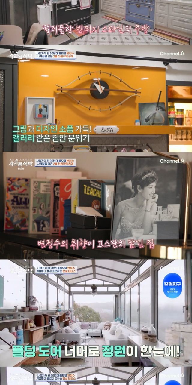 지난 2일 방송된 채널A '절친 토큐멘터리 - 4인용식탁'에서는 90년대 톱 모델이자 배우 변정수가 15년전 구입해 살고 있는 전원주택을 공개했다. 탁 트인 마당이 돋보이는 변정수 집은 15년 전 매매했다고 전해졌다. 위치는 경기 광주시로, 변정수를 닮아 스타일리시한 분위기를 풍겼다.