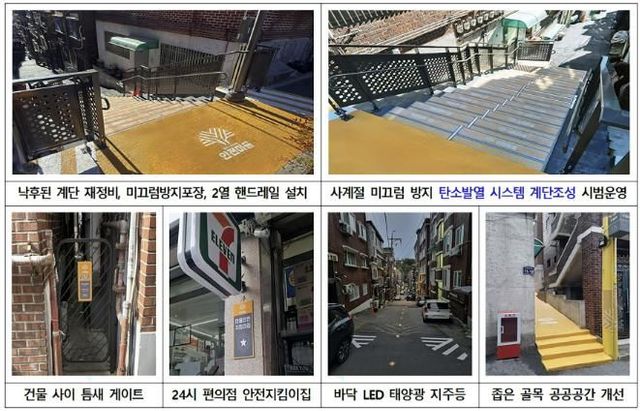 아울러 ▲골목길 바닥 매립형 조명 설치 ▲건물 사이 틈새 공간에 접근통제 사이문 설치 ▲신속한 위치 파악이 가능한 위치번호등 전신주 설치 ▲24시 편의점을 활용한 마을안전 지킴이집 적용 등 자연적 감시를 강화한 안전한 공공공간을 조성했다.