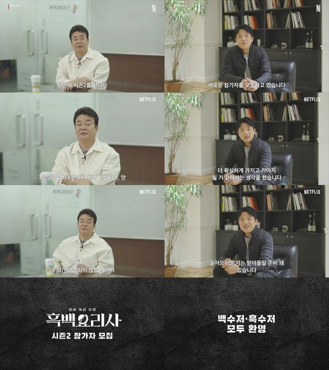 맛 하나는 최고라고 평가받는 재야의 고수 ‘흑수저’ 셰프들이 대한민국 최고의 스타 셰프 ‘백수저’들에게 도전장을 내밀며 치열하게 맞붙는 100인의 요리 계급 전쟁 ‘흑백요리사: 요리 계급 전쟁’ 시즌1은 지금 넷플릭스에서 만나볼 수 있다. 참가자 모집 시작으로 기대를 더하는 시즌2는 내년 하반기에 공개된다.