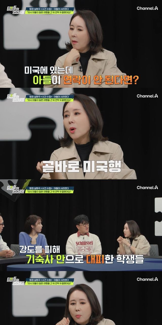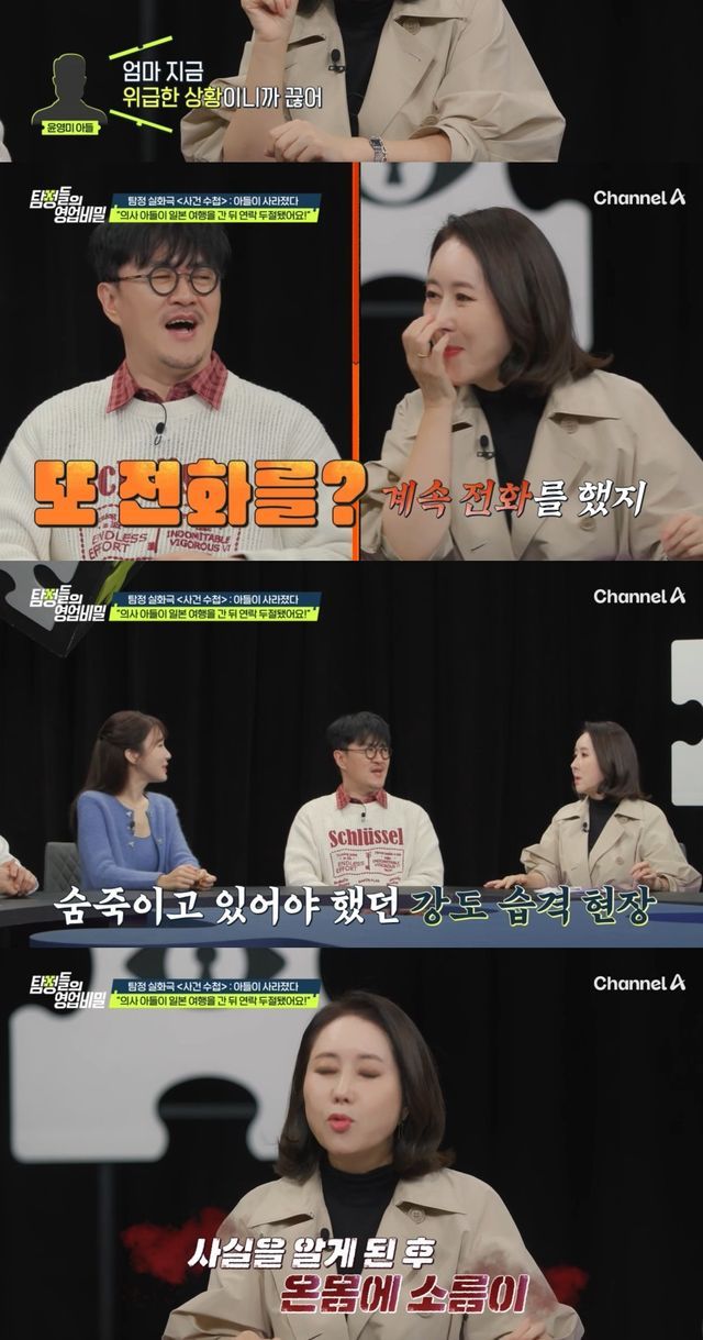 이날 방송에는 탐정실화극 '아들이 사라졌다' 에피소드가 공개됐다. 이를 함께 지켜보던 윤영미는 사연을 듣던 중 아들이 사라진 이유를 추측하다가 "아들이 미국에 있는데 연락이 안 되면 어떨 거 같냐"는 질문을 받았다.