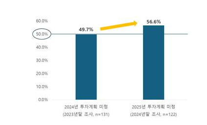 내년 투자계획을 수립한 기업(39곳) 중에서는 투자 규모를 올해보다 축소하는 경우(28.2%)가 확대하는 경우(12.8%)보다 많았다. 올해와 비슷한 수준이라고 답한 비율은 59.0%였다.