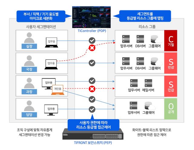 티프론트 ZT는 보안 스위치와 통합 관리 시스템으로 구성된 제품이다. 기존에 조직별로 세그멘테이션(네트워크 분할)하던 것을 사용자를 기준으로 바꾸는 ‘마이크로 세그멘테이션’ 기능을 탑재했다. 관리자가 지정한 정보기술(IT) 자산의 등급에 따라 사용자 접근 권한을 최소화해준다.