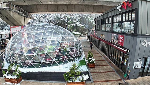 대형 돔이 설치된 ‘서대문구 카페폭포’ 전경. 서울 도심 속 ‘글로벌 힐링 명소’는 물론 ‘방송 촬영지’로도 각광받고 있다./ 서대문구 제공