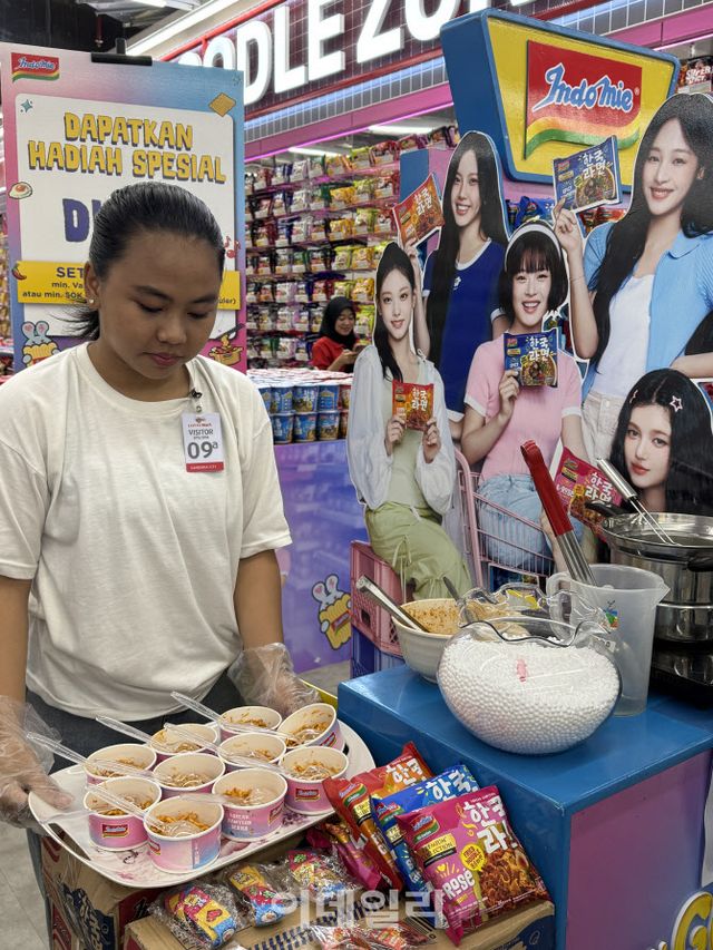 한켠에는 인도네시아의 1위 라면 업체가 출시한 ‘한국라면’ 시식코너도 마련돼 있었다. 한국 글씨로 또박또박 적힌 글씨에, 인기 아이돌 그룹 뉴진스를 모델로 한 한국라면은 현지의 뜨거운 관심을 증명했다.