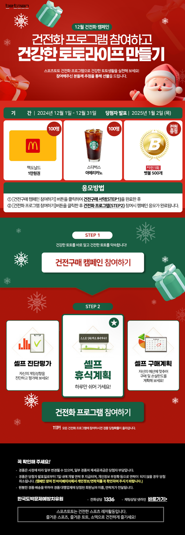 국민체육진흥공단이 발행하는 체육진흥투표권 스포츠토토의 공식 인터넷 발매사이트 베트맨이 12월 건전화 캠페인인 ‘건전화 프로그램 참여하고 건강한 토토라이프 만들기’ 이벤트를 오는 31일까지 진행한다고 밝혔다.