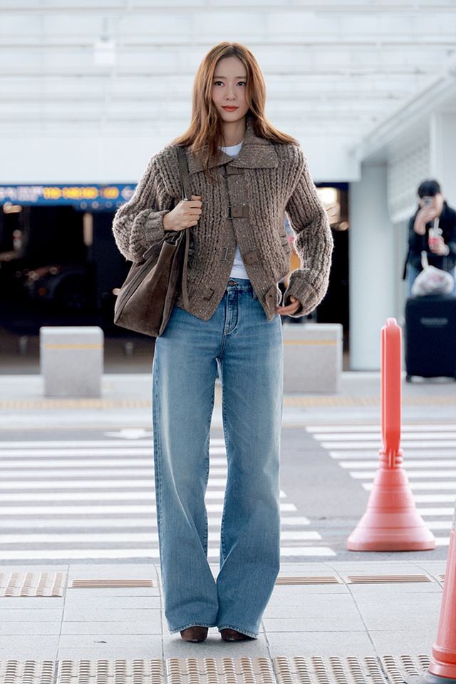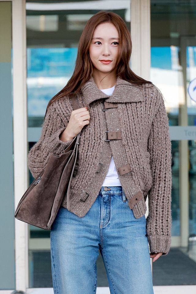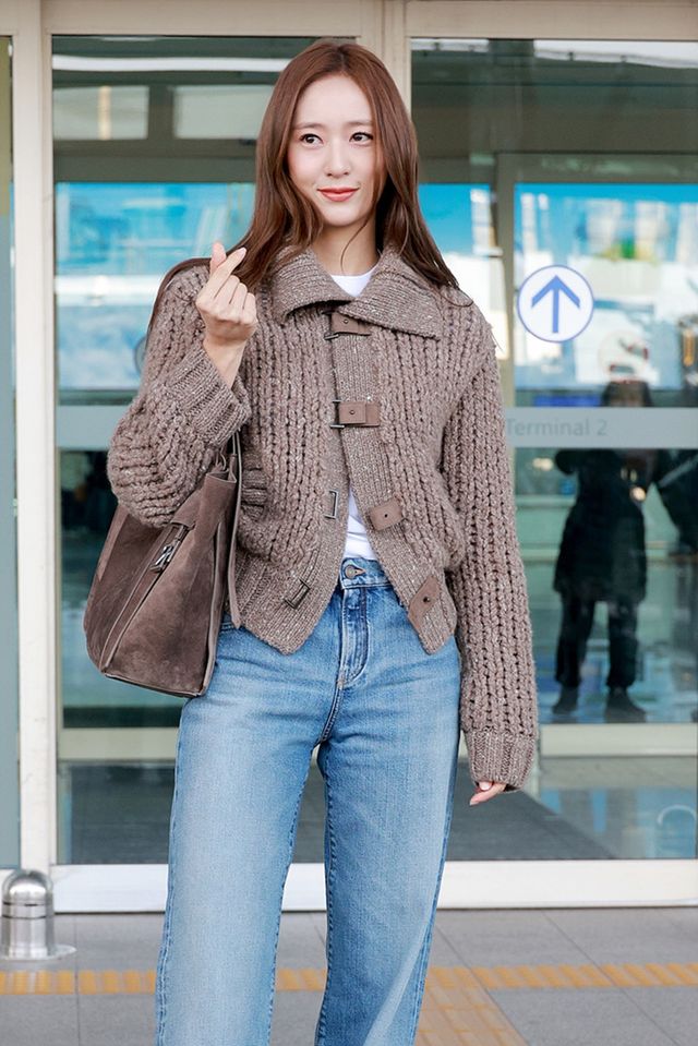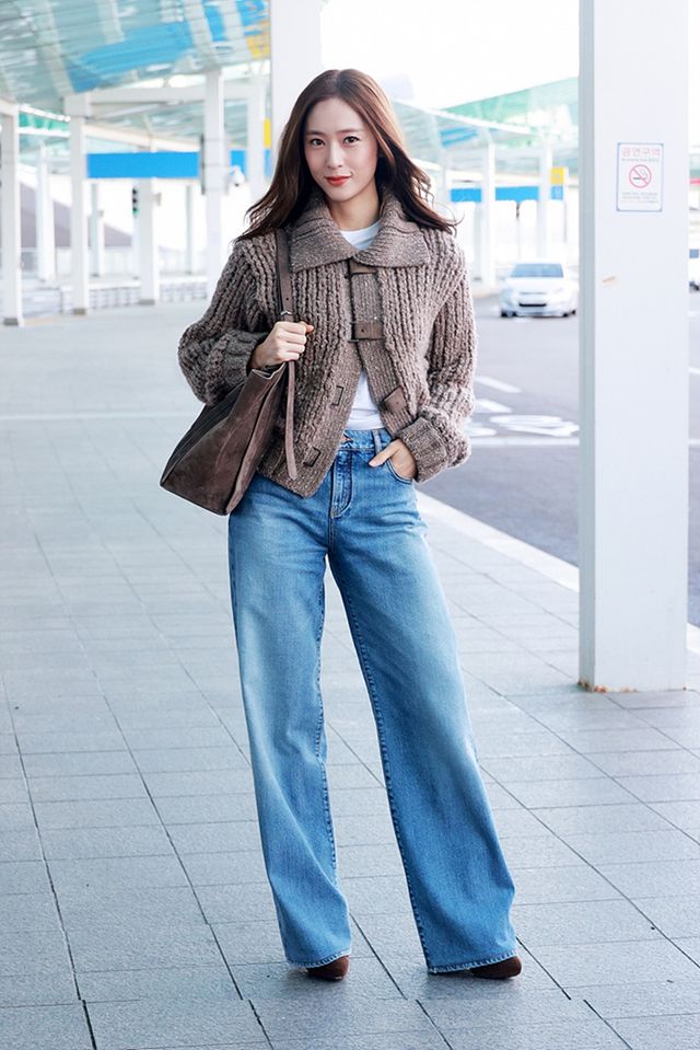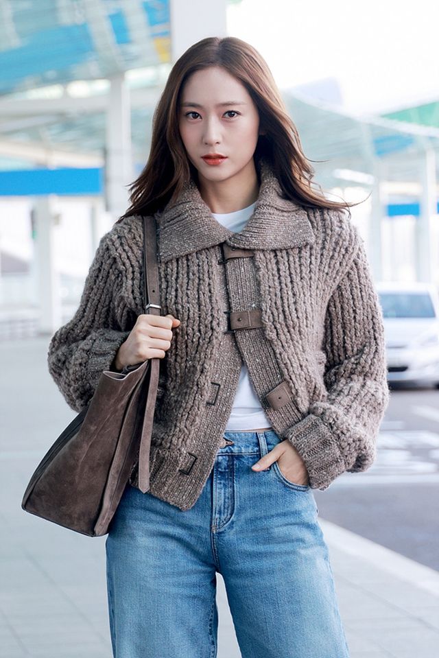 출국에 앞서 정수정은 램 스웨이드 소재의 버클 클로저가 특징인 포근한 무드의 도네갈 카디건과 여유로운 와이드 레그 실루엣의 미디엄 워싱 처리된 데님팬츠를 착용해 고급스러우면서도 멋스러운 출국 패션을 선보였다.