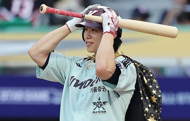 7월 6일 오후 인천시 미추홀구 문학동 SSG랜더스필드에서 열린 '2024 신한 SOL Bank KBO 올스타전’ 나눔 올스타와 드림 올스타의 경기에서 나눔팀 키움 김혜성이 익살스러운 복장을 착용한 뒤 타석에 서고 있다. / 뉴스1