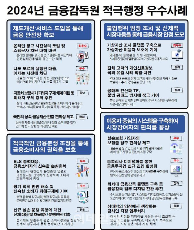 금융감독원은 지난 2일 ‘2024년도 적극행정위원회’ 의결을 통해 우수부서 3개 및 우수직원 11명을 확정했다고 3일 밝혔다. 적극행정 우수사례 수상자들에게는 향후 특별 승진·승급, 연수 우대 등 파격적 인센티브를 부여할 계획이다.