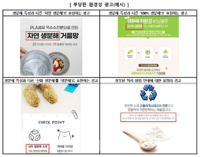 부당광고 유형별로는 △별도 퇴비화 시설에서 분해 가능한 제품으로 인증받았음에도 인증 내용과 다르게 ‘자연 생분해’ ‘100% 생분해’ ‘산화 생분해’를 ‘생분해로 주장’하는 표현을 사용한 제품이 54개 △‘음식물쓰레기와 함께 배출 가능’ 등 잘못된 처리 방법을 광고한 제품 7개 △시험성적서 및 인증서 등 과학적 근거를 판매페이지에 제시하지 않은 제품 41개였다.