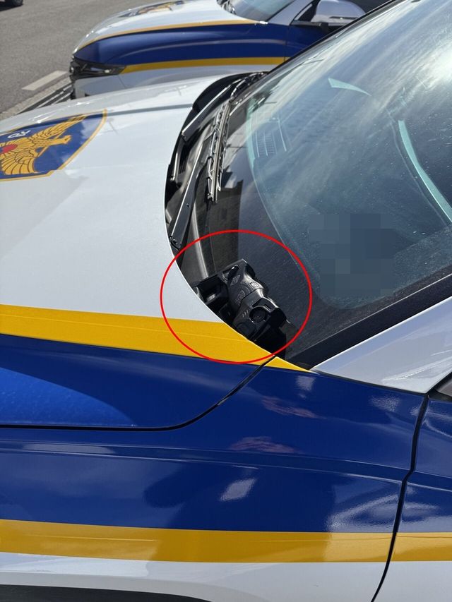 공개된 사진에는 경찰차 앞 유리창 위, 와이퍼 옆에 검은 총기류가 덩그러니 놓여 있다.