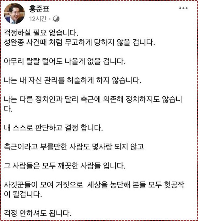 이어 홍 시장은 “사기꾼들이 모여 일시적으로 세상을 농단하려 해도 결국 헛된 공작이 될 뿐”이라며 “걱정하지 않아도 된다”고 덧붙였다.