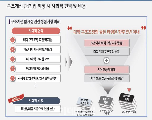 김 교수는 “제22대 국회에서도 사립대학 구조개선의 필요성을 인식해 현재 여·야가 5건의 유사 법안을 발의한 상태”라며 “법 제정이 지연되면 대학 구성원을 포함한 지역 주민, 미래의 학생과 학부모가 고통을 받을 수 있으며, 구조조정 지연으로 인해 고등교육 생태계의 미래도 보장할 수 없을 것”이라고 우려했다. 그러면서 “현재 발의된 법안의 미세조정에 초점을 맞추기보다는 조속히 입법해 대학의 구조조정을 촉진할 법적·재정적 지원을 해야 한다”고 주장했다.