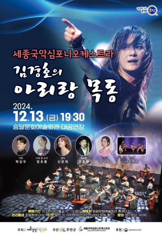[파이낸셜경제=김영란 기자] 전남 무안군은 2024 공연예술유통사업에 선정된 특별 공연 ‘세종국악심포니오케스트라 · 김경호의 아리랑목동’을 오는 12월 13일 저녁 7시 30분 승달문화예술회관 대공연장에서 개최한다.