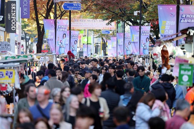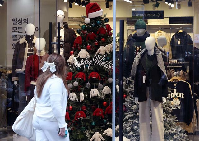 1일 서울 중구 명동거리에서 겨울옷이 전시된 쇼윈도 앞으로 관광객들이 오가고 있다. / 뉴스1
