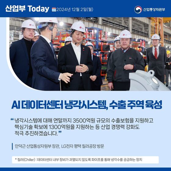 산업통상자원부는 인공지능(AI) 데이터센터의 냉각시스템을 수출 주역으로 육성하기 위해연말까지 3500억 원의 수출보험을 지원하고, 핵심기술 확보에 1300억 원, 차세대 시스템 실증에 180억 원 등을 투입하기로 했다.