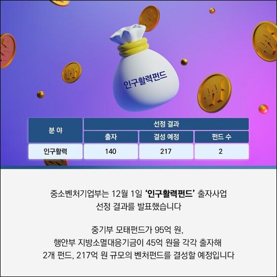 중소벤처기업부는 1일 이 같은 내용의‘인구활력펀드’ 출자사업의 선정 결과를 발표했다.