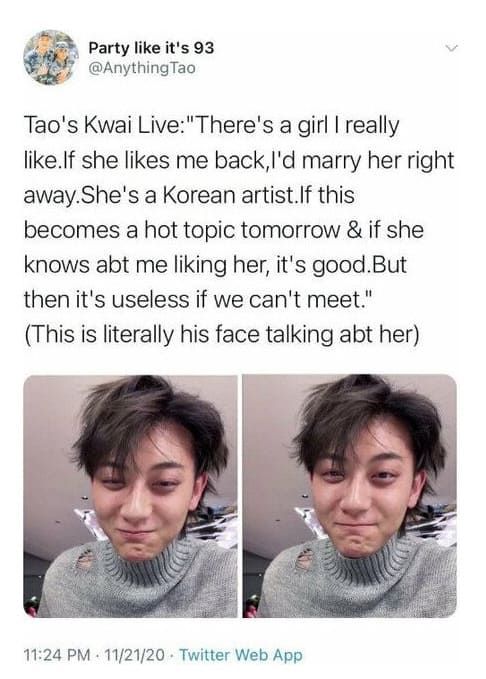 또 타오는 "그녀에게 디엠도 보냈지만 답이 없어서 슬프다. 나는 그녀와 정말 사귀고 싶지만 같은 국가가 아니라서 슬프다"면서 "이게 화제가 되서 실검에 올라가면 내가 그녀를 사랑하는 것이 알려지게 될 것이다. 의미있는 일이다"라고 주장했다.