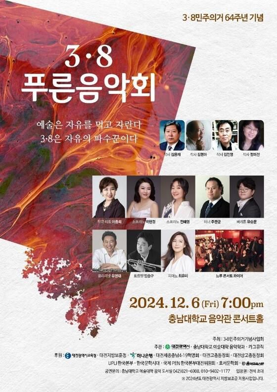 대전시와(사)38민주의거기념사업회(회장이양희)는38민주의거64주년을기념하여6일(금)저녁7시충남대학교음악관콘서트홀에서38푸른음악회를개최한다.