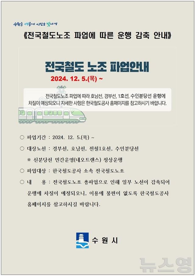 (수원=뉴스영 이현정 기자) 전국철도노동조합이 5일부터 총파업을 예고함에 따라 수원시가 비상수송대책을 마련했다.