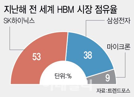 HBM은 여러 개의 D램을 수직으로 쌓아 올려 만든 고성능 메모리로 인공지능(AI) 가속기 핵심 반도체다. 전 세계 HBM 시장은 삼성전자와 SK하이닉스가 90% 안팎을 장악하고 있다.