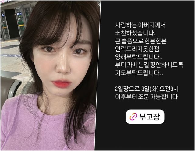 3일 하유비는 자신의 인스타그램 스토리에 "사랑하는 아버지께서 소천하셨습니다. 큰 슬픔으로 한 분 한 분 연락드리지 못한 점, 양해 부탁드립니다"라며 "부디 가시는 길 평안하시도록 기도 부탁드립니다"라고 전했다.
