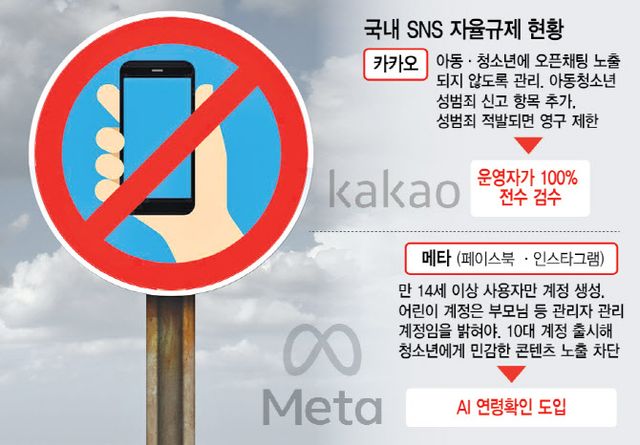 사업자 자율 규제가 청소년을 SNS 부작용으로부터 보호하기 위한 실질적인 방안으로 떠오르는 이유다. 카카오(035720)는 아동·청소년이 오픈채팅 내 유해 콘텐츠에 노출되지 않도록 관리하고 있다. 아동청소년 성범죄 관련 신고 항목을 추가하고 성범죄로 적발되면 카카오 사용 자체를 영구 제한한다. 메타(페이스북 ·인스타그램)는 만 14세 이상 사용자만 계정을 생성할 수 있게 하고 어린이 계정은 부모님 등 관리자 관리 계정임을 밝혀야 한다. 10대 전용 계정을 출시해 청소년에게 민감한 콘텐츠 노출을 차단하고 있다.