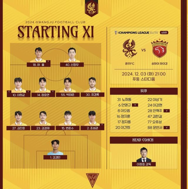 이정효 감독이 지휘하는 광주는 3일 오후 9시 상하이 하이강(중국)과 2024~25 아시아축구연맹(AFC) 챔피언스리그 엘리트(ACLE) 리그 스테이지 6차전 원정 경기를 치른다.