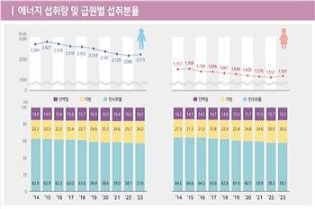 에너지 섭취량은 2022년 대비 다소 증가(남 ↑27.6kcal, 여 ↑39.9kcal)했다.