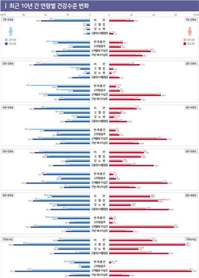 최근 10년 간 성인의 연령별 건강행태와 만성질환 유병 수준의 변화를 살펴보면 다음과 같다.
