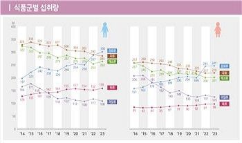육류(남 ↑5.6g, 여 ↑1.8g), 음료류(남 ↑12.9g, 여 ↑2.5g)는 소폭 증가했다.