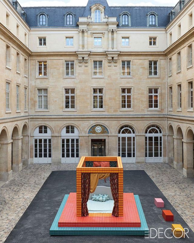 파리의 오랜 역사를 함께한 상징적 건물, 호텔 드 라 마린(Ho^tel de la Marine)의 야외 중정에선 화려한 침실 풍경이 펼쳐졌다. 건축 스튜디오 위크로니아(Uchronia)는 18세기 왕실 가구를 보관하는 용도로 사용된 건물의 역사에 경의를 표하며 전통적 캐노피 침대와 프랑스식 침대를 재해석한 설치미술 작품을 선보인 것. 선명하고 풍부한 컬러는 당시 호텔의 가구를 감독했던 피에르 엘리자베스 드 퐁타니외(Pierre-E′lisabeth de Fontanieu)의 침실에서 영감을 받았다.